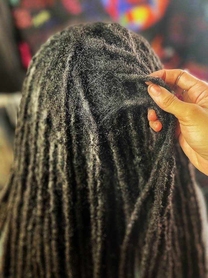The hair is palmrolled while being retwisted at the same time ensuring roots that are twisted to the base. Clips are commonly used to hold the locs down in place until after the blow drying process. Lasting between 2 to 8 weeks depending on if styled, maintenance, activity level, and humidity.